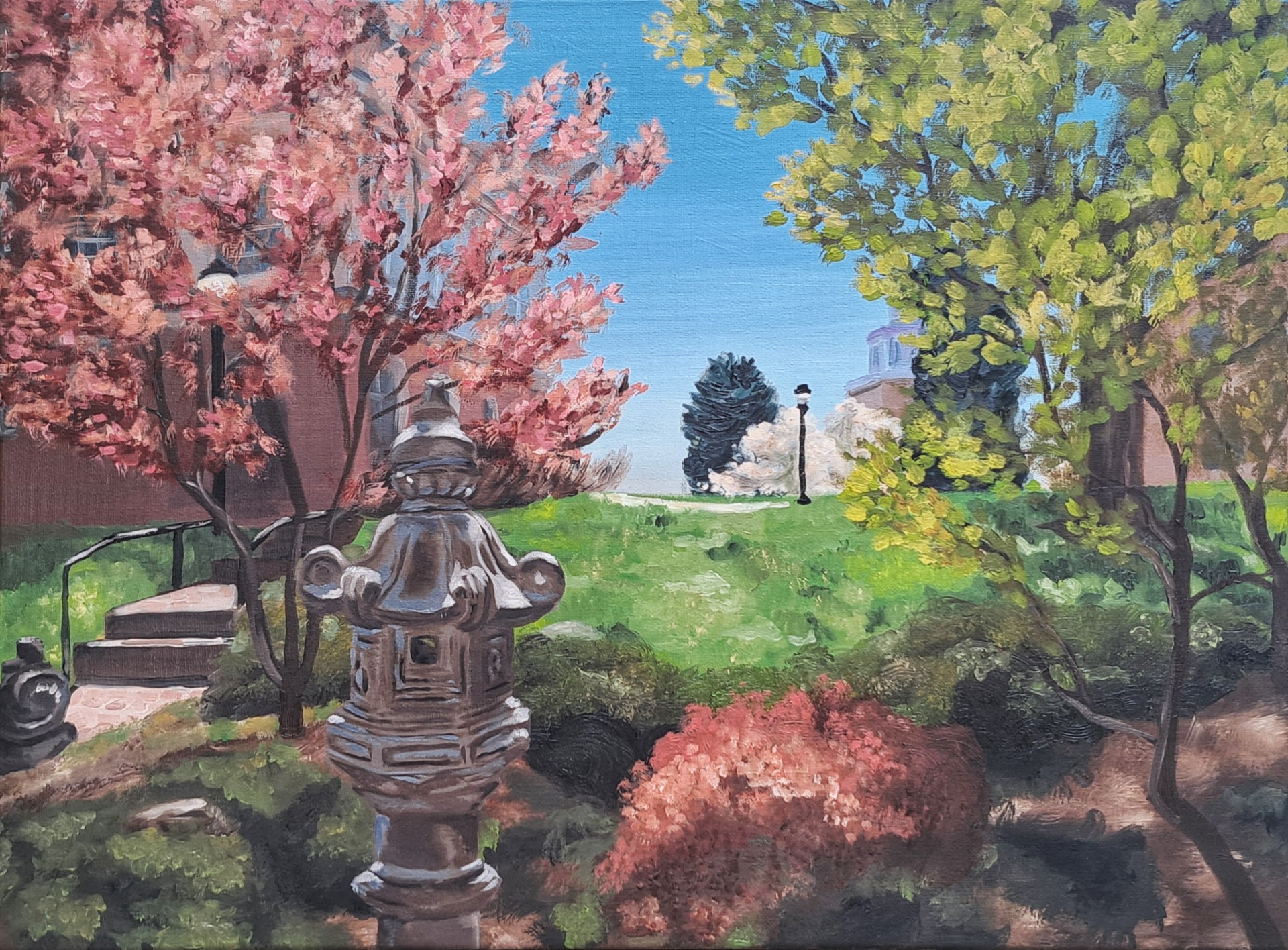 Madeline Madamba (Psychology major, Class of 2026) created this painting of the Zen Garden, which was displayed at Brompton in April 2026. According to Maddie, the work serves as a personal tribute to UMW and to the Asian and Asian American community on campus, reflecting her identity as a half-Filipina artist. The painting was completed as part of Professor Ashe Laughlin’s Painting I assignment, in which students were asked to depict a location on campus. Maddie chose the Zen Garden, noting that “it is a location that not many know about. It gets beautiful sunshine during the day, has a colorful array of foliage, and is also in a quieter section of campus away from the general sprawl. My goal was to capture this serene feeling in the artwork and allow the viewer to see an angle of the campus seldom experienced by the average student. The process of creating the painting itself was challenging, but enjoyable, nonetheless. The best element is the lantern holder in the center; the geometry is just beautiful, and I wanted to make that the focal point of the piece.”