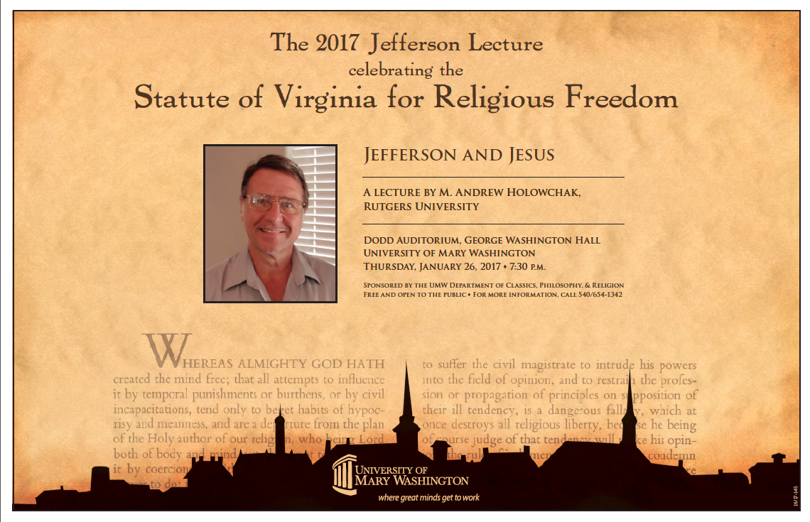 On January 26th in GW’s Dodd Auditorium, Professor M. Andrew Holowchak, who has eight books/anthologies on Thomas Jefferson since 2012 and who has been called ‘the world’s foremost expert in Jefferson’s philosophical thought,’” delivered this year’s lecture, entitled “Jefferson and Jesus.” If you were unable to come or want to revisit the lecture, you can now access it here!
