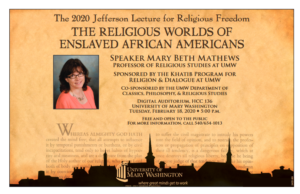 The Department of Classics, Philosophy, and Religious Studies and the Khatib Program for Religion and Dialogue at UMW are happy to announce the 2020 Jefferson Lecture. Our own Professor Mary Beth Mathews will speak on “The Religious Worlds of Enslaved African Americans” on Tuesday, February 18th at 5 p.m. in the HCC Digital Auditorium. We hope you’ll join us!