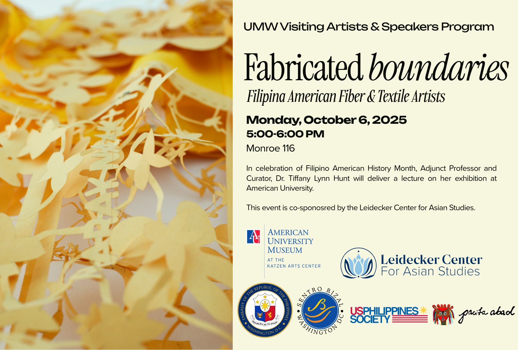 As of 2023, the US Census Bureau estimated that 4.6 million people living in America identified as Filipino, making it the third-largest Asian population in the United States. Of that total, 47% are immigrants, many of whom are Filipina women who work as nurses, service workers, and caregivers. Yet, to speak about a Filipina American diaspora and its impact on the visual arts requires a nuanced understanding of identity, culture, and complicated histories. To commemorate Filipino American History Month, this talk brings the exhibition Fabricated Boundaries: Filipina American Fiber and Textile Artists to the UMW campus. Featuring four artists—Pacita Abad, Mic Diño Boekelmann, Jeanne F. Jalandoni, and Patricia Orpilla—this intergenerational project brings women on both sides of the diaspora together: those who immigrated to the US, and the children of Philippine immigrants. At the heart of the show lies a simple question: how do artists use material histories to fabricate their agency between real, imagined, perceived, and prescribed boundaries. The exhibition was curated by Dr. Hunt and is currently on display at American University.