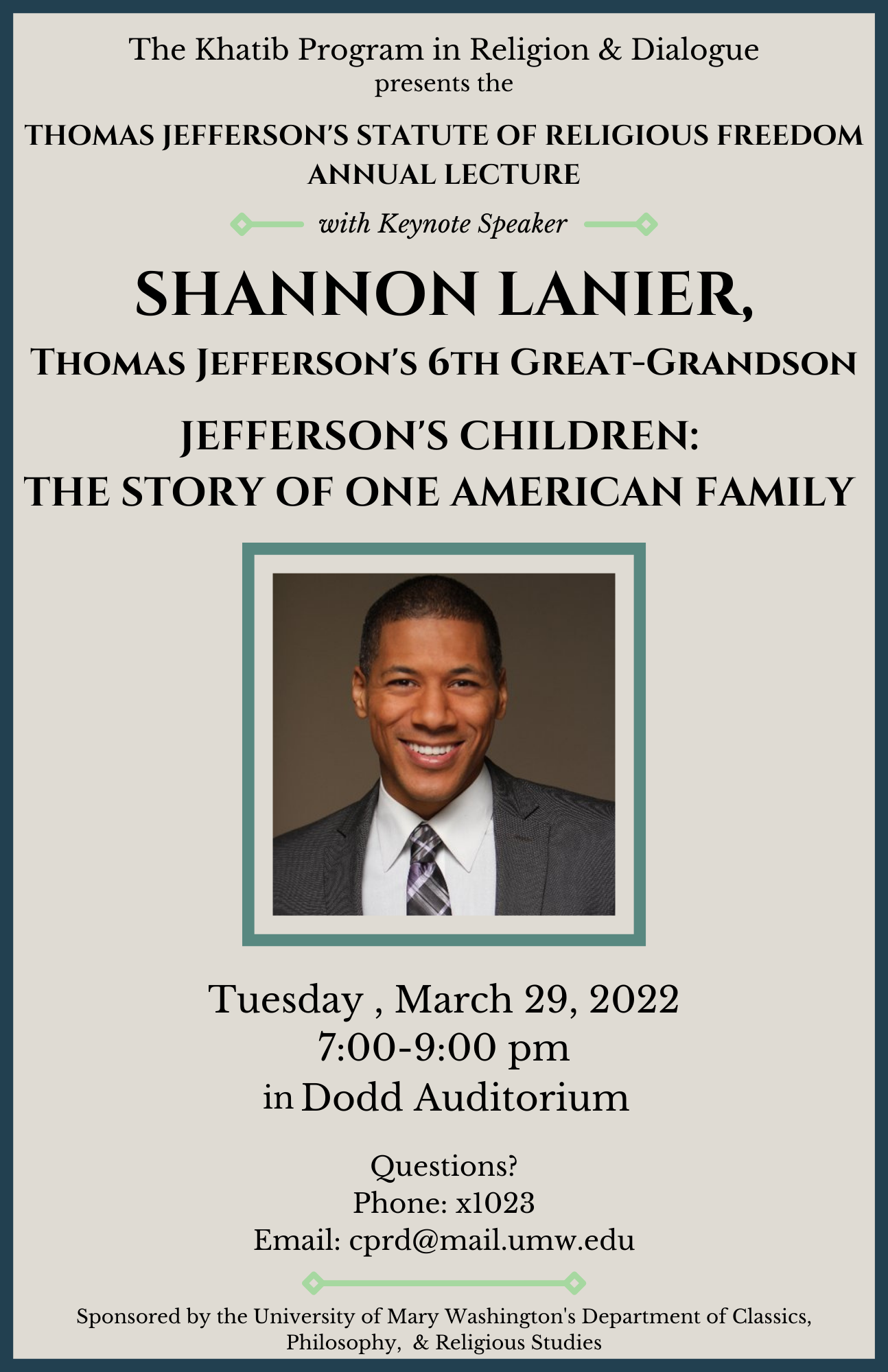 March 30th, 7pm until 9pm in Dodd Auditorium.