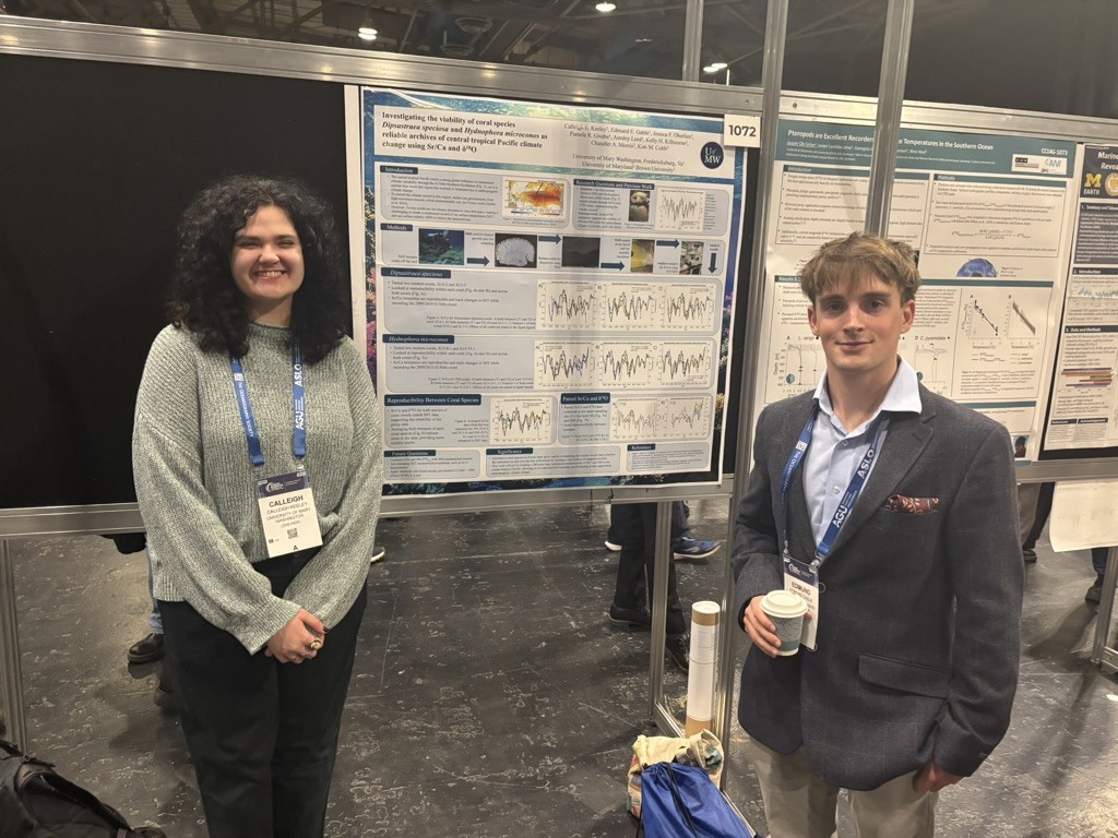 Congratulations to Jessica Oberlies (Env. Sci. ’25) for taking first place on her poster presentation at UMW’s 2023 Summer Science Symposium on her coral and climate research. Her project is titled, “A new coral geochemical archive to reconstruct central tropical Pacific climate” and she is mentored by Dr. Grothe. Their work hopes to better understand the climate impacts in the tropical Pacific.
