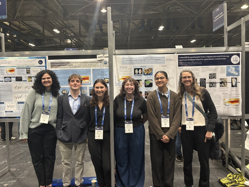 Five EESC research students and Dr. Pamela Grothe attended the American Geophysical Union’s Ocean Sciences Meeting in Glasgow, Scotland, from Feb. 22 – 27 to present their undergraduate research projects. Dr. Grothe and the students are reconstructing climate conditions in the tropical Pacific using geochemistry from coral skeletons and clam shells. They presented four posters, ranging from testing new coral and clam species as climate recorders to using fossil samples to reconstruct past climate conditions before instrumental records.