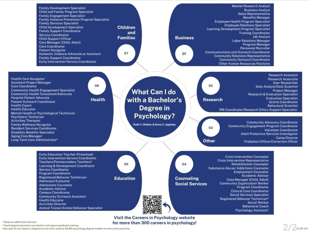 - Look over this display of occupations for more ideas from Walker and Appleby (Walker, R. & Appleby, D. C. (2022). “What Can I do with a Bachelor’s degree in Psychology?” Open Educational Resources.